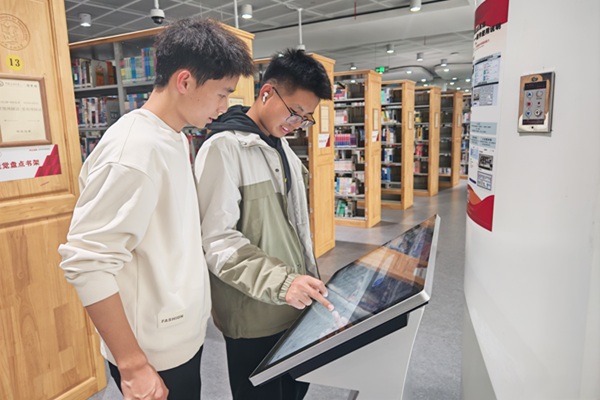 在图书馆,讲解员首先向新生们介绍了图书馆的整体布局,包括东馆的具体位置、各楼层功能分区以及平面图展示。在一层大厅,新生们体验了AI智能馆员服务,使用了瀑布流电子屏幕,并在工作人员的指导下学习通过网络或现场机器预约座位。此外,讲解员还介绍了自助借书、打印等便捷服务设施,以及馆内为满足多样化学习需求而设置的不同功能座位。在二层,讲解员重点介绍了研讨间的使用功能及其预约流程,这些空间为学生开展小组讨论、学术交流提供了便利条件。