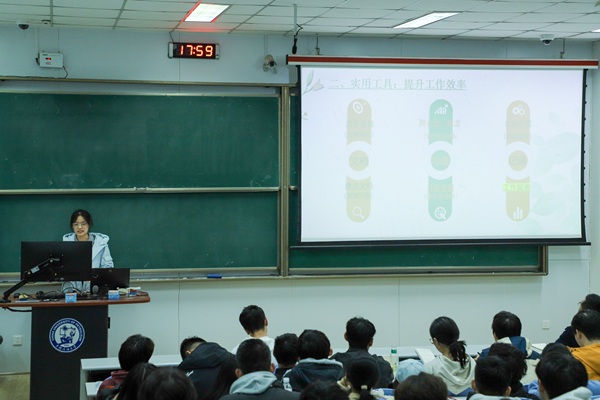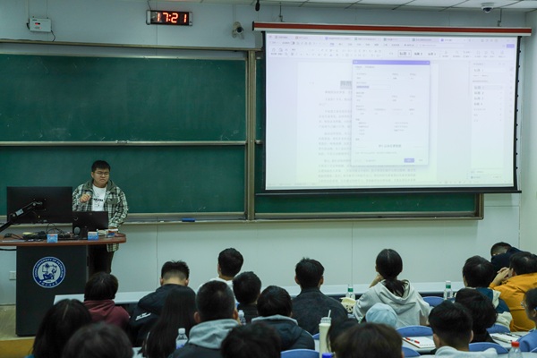 培训伊始,王嘉详细介绍了excel、word、PPT等常用办公工具的操作技巧,以统计学生信息为例向学生干部展示了设置信息隐藏、标注重点对象、调整行高等功能,以及word排版、删除空格、调整行距段间距、插入图片时设置环绕、对齐类型等实用技巧,帮助学生干部熟悉和掌握基础工作。