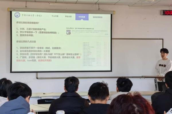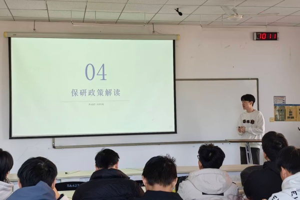 活动伊始,邹晨宇围绕个人履历、学业方法、科创竞赛、保研政策四大板块展开。针对专业核心课程,他分享了“课上专注听讲、课后多交流研讨”的学习技巧,鼓励同学们提升自主学习能力。随后,他结合自身经历,详细拆解保研全流程,涵盖目标院校筛选、申请材料筹备、面试应答策略等实用内容。接着,他分享了科创竞赛的备赛心得,建议同学们尽早参与课题研究、积累科研经历,强调学科竞赛对锻炼实践能力、培养团队精神及丰富保研履历的多重价值。最后,他解析了最新保研政策,介绍了专业发展前景,呼吁同学们以学业为基、积极参赛提升综合素养。