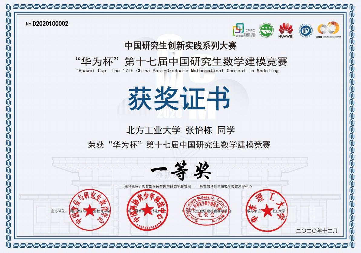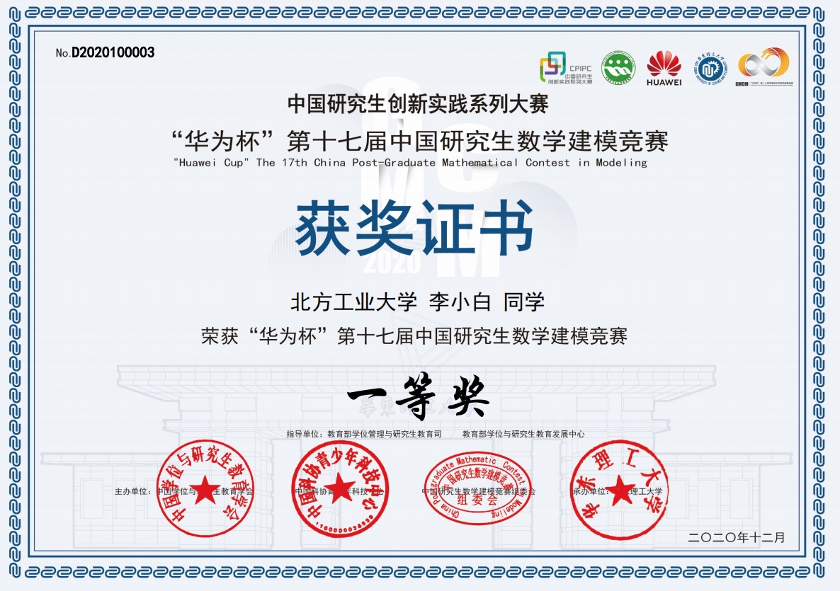 “华为杯”第十七届中国研究生数学建模竞赛成绩揭晓。awc777万象城娱乐官网研究生李想、张怡栋和李小白获得全国一等奖。