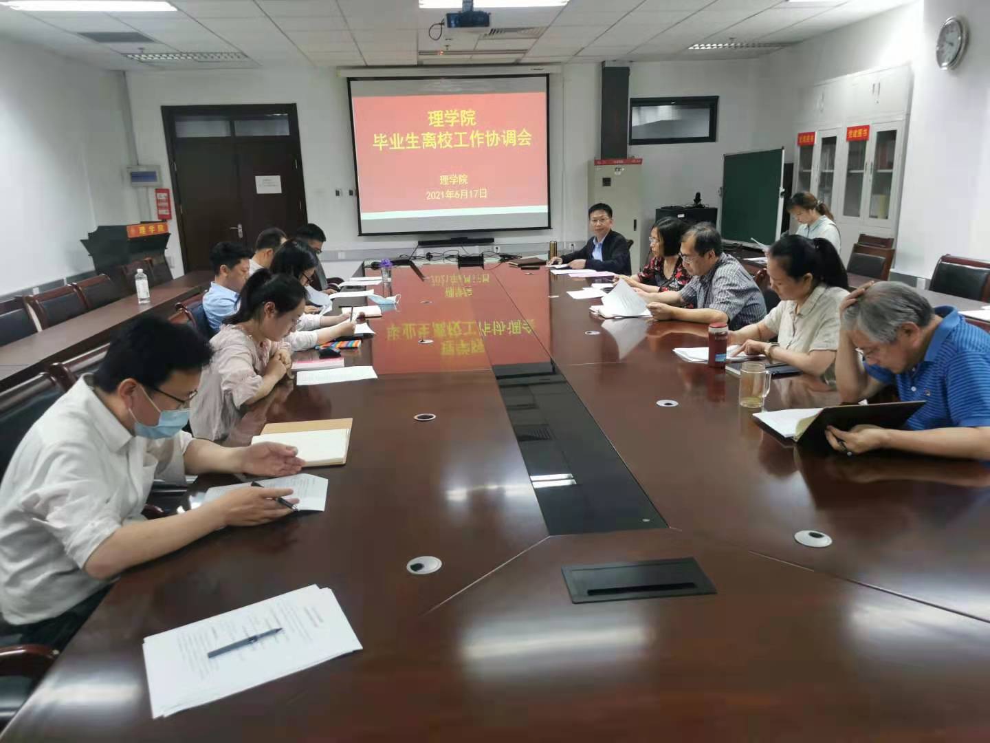 6月17日下午,awc777万象城娱乐官网在博远楼805召开2021届毕业生离校工作会。学院班子成员、各系主任、责任教授、毕业班导师、辅导员、办公室成员参加会议。会议由党委副书记李冱岸主持。