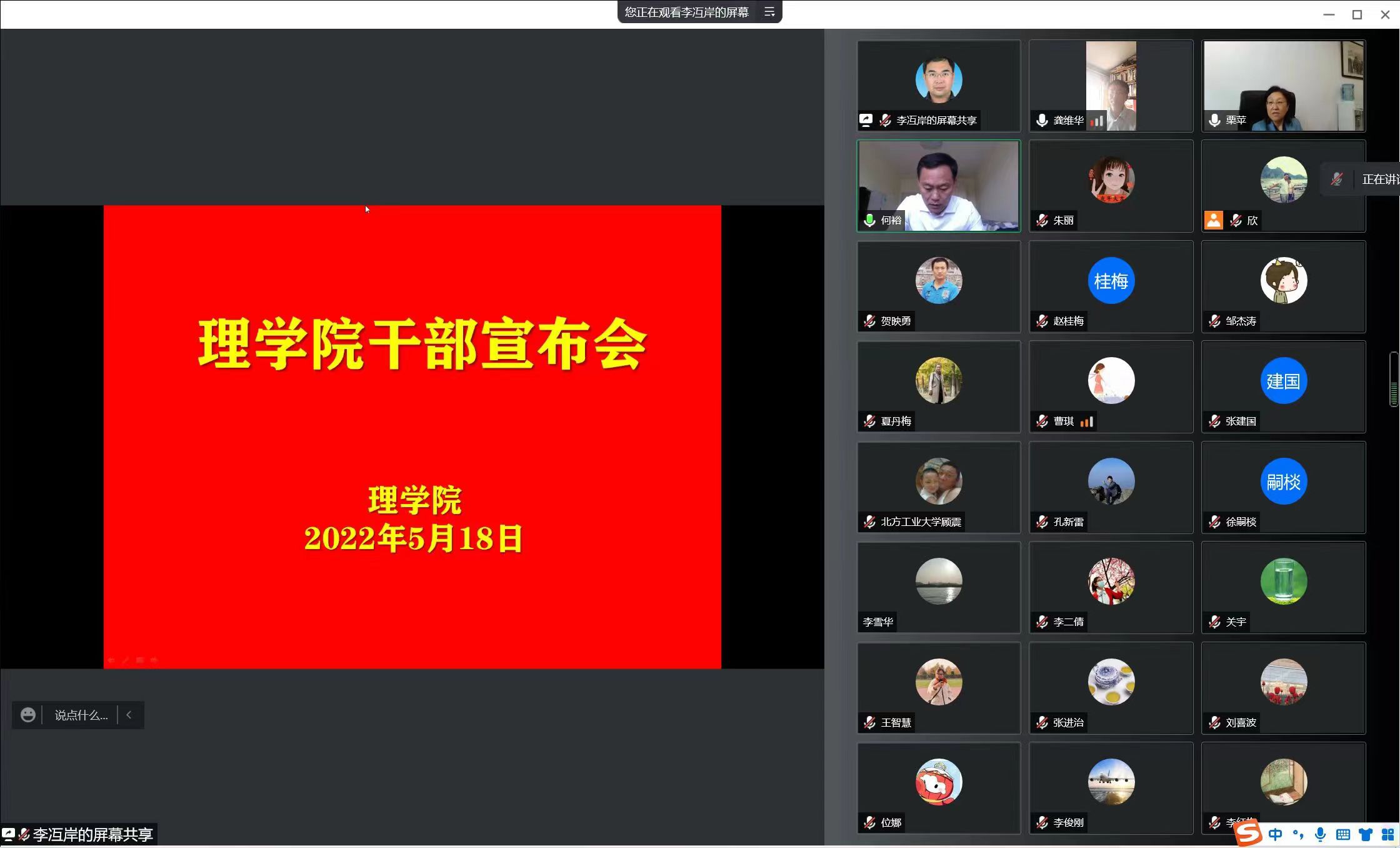 5月18日下午,awc777万象城娱乐官网以线上腾讯会议的方式召开领导干部任命大会。校党委常委、副校长栗苹、校党委组织部部长何裕以及学院全体教职工参加会议。会议由学院党委书记龚维华主持。