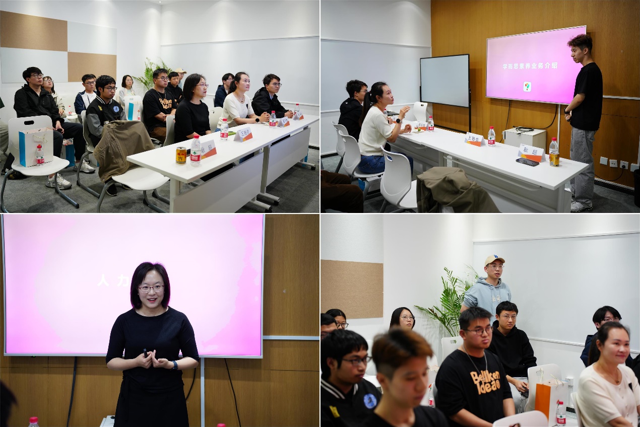 在座谈交流环节中,学而思教师备课组主管耿超老师介绍了学而思的发展历程,强调“学而思素养”以“激发兴趣”为核心价值,以“学以致用”为培养目标,致力于培养孩子面向未来的创造能力和科学家精神。人力资源部负责人王艳丽老师介绍了学而思的企业文化、晋升制度、福利待遇以及近期的用人需求和招聘情况等,同学们就招聘流程和培养机制等方面的困惑与学而思老师进行交流互动。学而思方面也积极回应了同学们的问题并对同学们未来应聘学而思相关岗位表示热烈的欢迎。