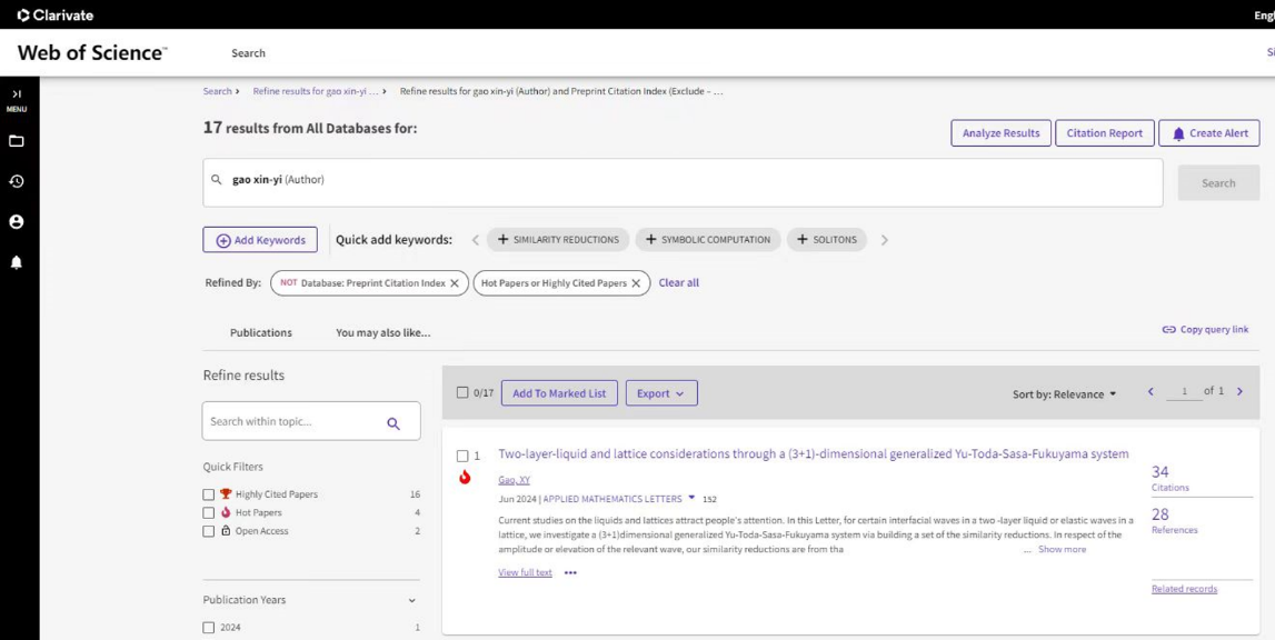 近日,象城娱乐官网awc777万象城娱乐官网教师高心怡在Applied Mathematics Letters(应用数学快报)发表的标题为Two-layer-liquid and lattice considerations through a (3+1)-dimensional generalized Yu-Toda-Sasa-Fukuyama system[通过(3+1)维广义Yu-Toda-Sasa-Fukuyama系统考察双层液体和晶格]的文章入选“ESI热点论文”。