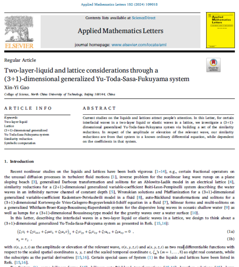 Applied Mathematics Letters为SCI检索一区top期刊,高心怡发表的论文旨在解析研究描述双层液体中若干界面波或晶格中若干弹性波的(3+1)维广义Yu-Toda-Sasa-Fukuyama系统。