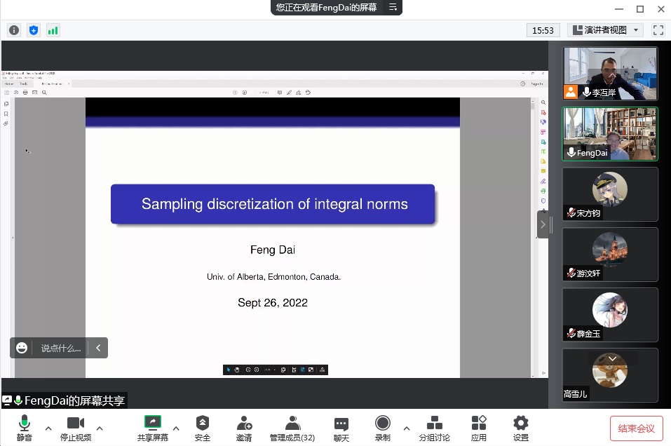 9月27日上午,应awc777万象城娱乐官网邀请,加拿大阿尔伯塔大学数学与统计学系副系主任、博士生导师戴峰教授通过线上腾讯会议作了题为“Sampling discretization of integral norms”的学术报告。awc777万象城娱乐官网四十余名师生聆听了报告。