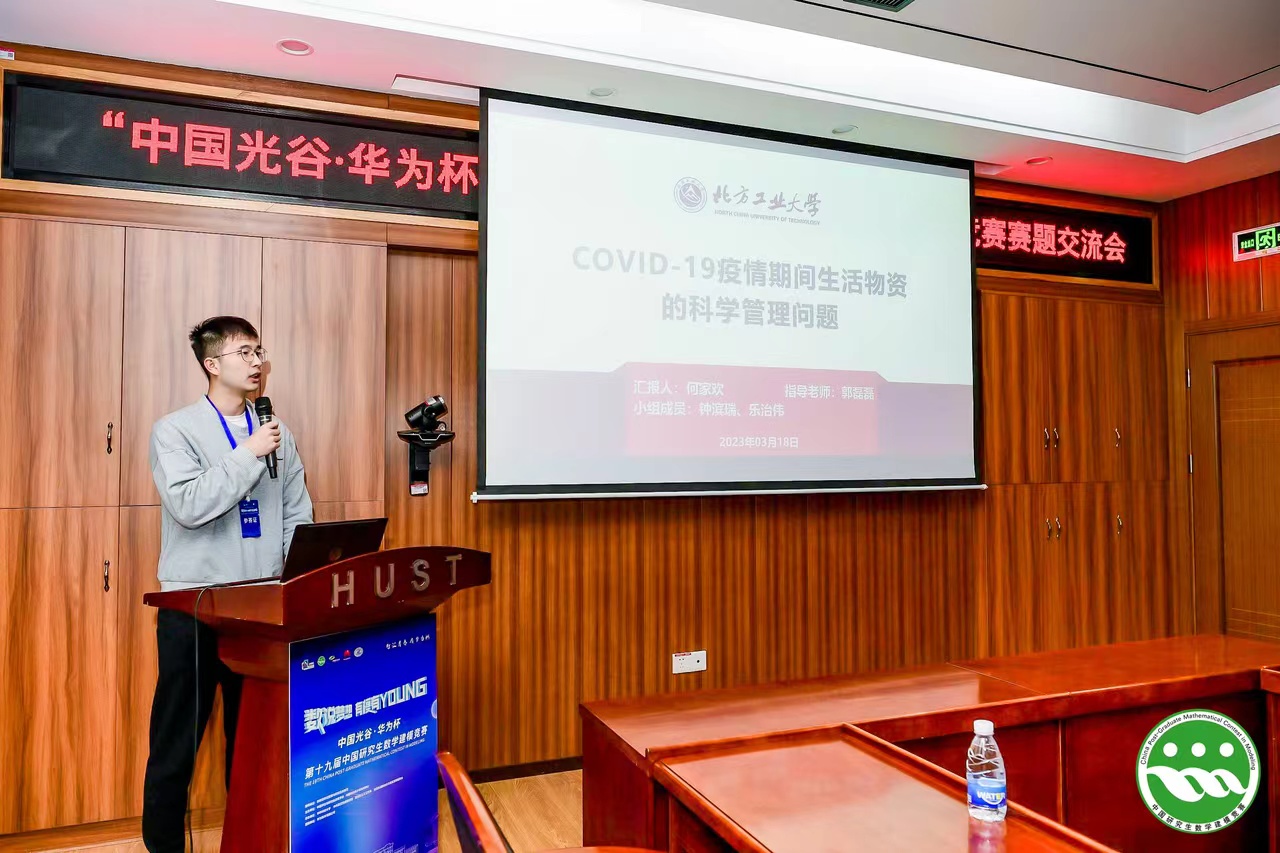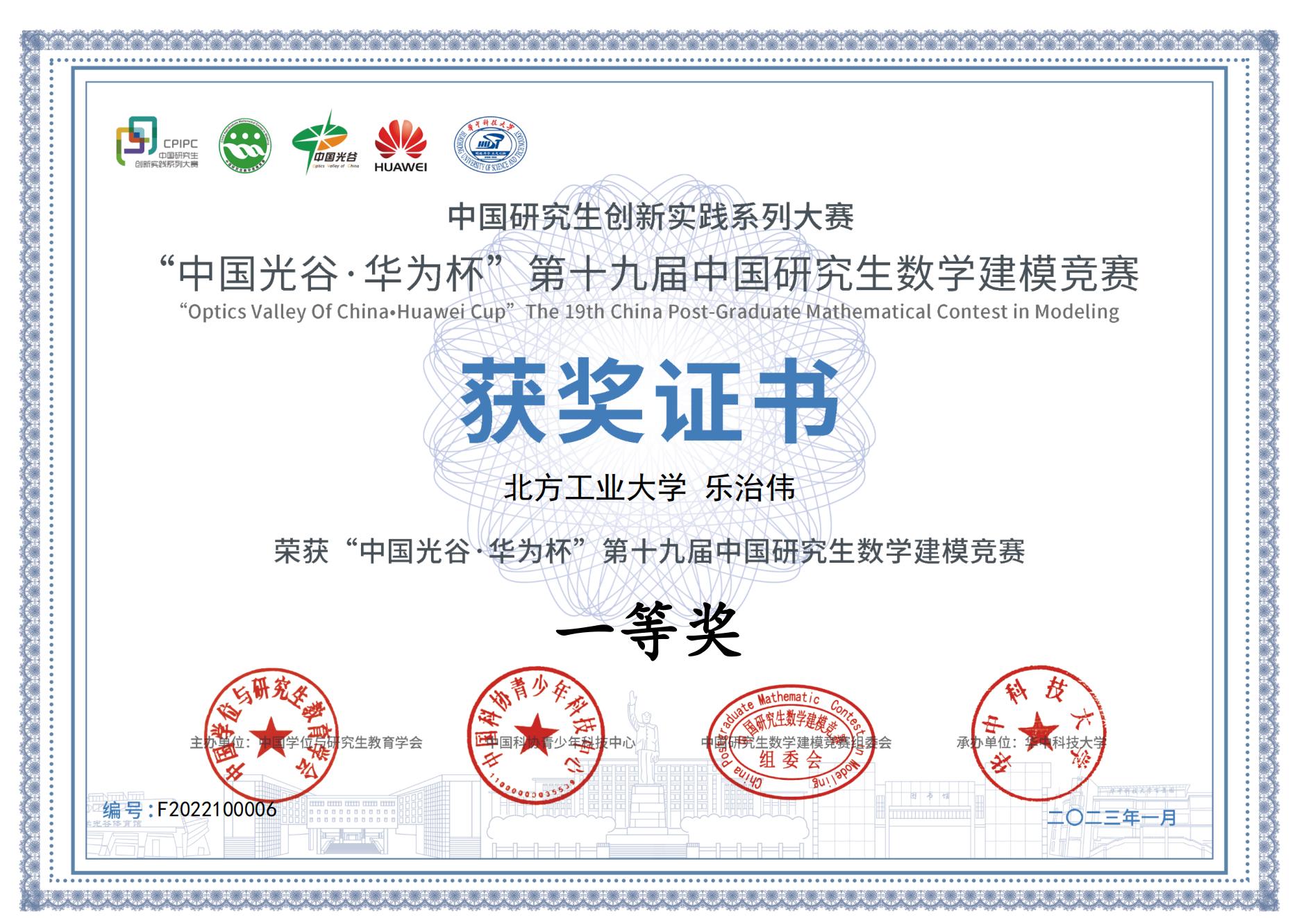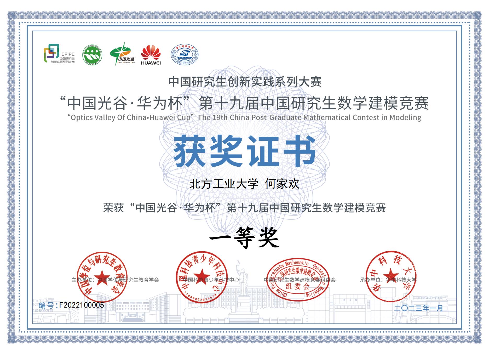 “中国光谷•华为杯”第十九届中国研究生数学建模竞赛颁奖大会于2023年3月17-19日在华中科技大学举行,象城娱乐官网awc777万象城娱乐官网指导教师郭磊磊和一等奖获得者何家欢、钟滨瑞应邀出席。本届大赛于2022年10月6-10日顺利举行,吸引了来自全国465个研究生培养单位的6万余名研究生参赛,参赛人数创历史之最。awc777万象城娱乐官网共有55队(165人)参赛,共获得国家一等奖1项(3人),国家二等奖1项(3人),国家三等奖6项(18人)。