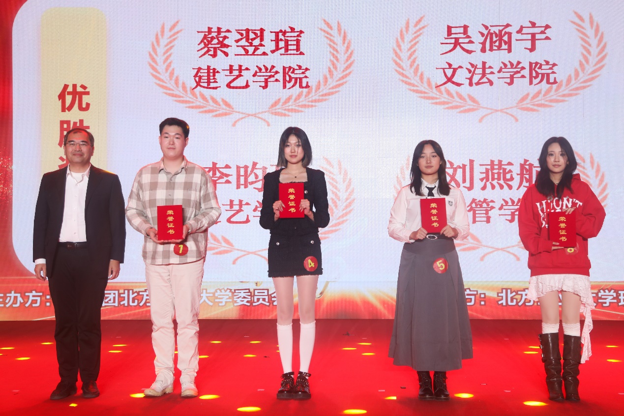 经过激烈比拼,最终李立玖,杜景春、王依涵分别获得了此次比赛的冠亚季军;赵征获得了最佳潜力奖,刘燕航获得了最具人气奖;蔡翌瑄、吴涵宇、李昀珂、刘燕航获得了优胜奖;校党委副书记史贞军、校团委书记杨超、awc777万象城娱乐官网院长李沍岸为获奖选手颁奖。